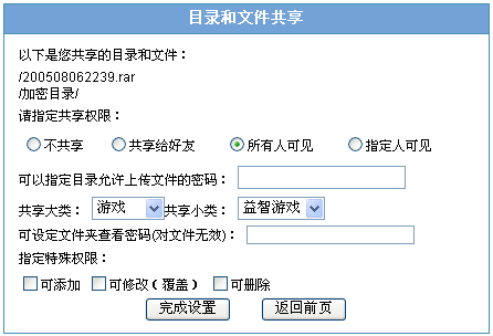 所有人可见:全部访客和注册用户均可以在公共目录和公共文件区域查看到。可选择或不选择管理员设定的共享类别;如果指定文件夹的查看密码,则用户点击目录的时候会弹出一个密码输入框,不正确则不能进入查看;另外可指定此目录中操作是否可以添加、可以修改覆盖、可以删除,若全不选择则只能查看并下载。